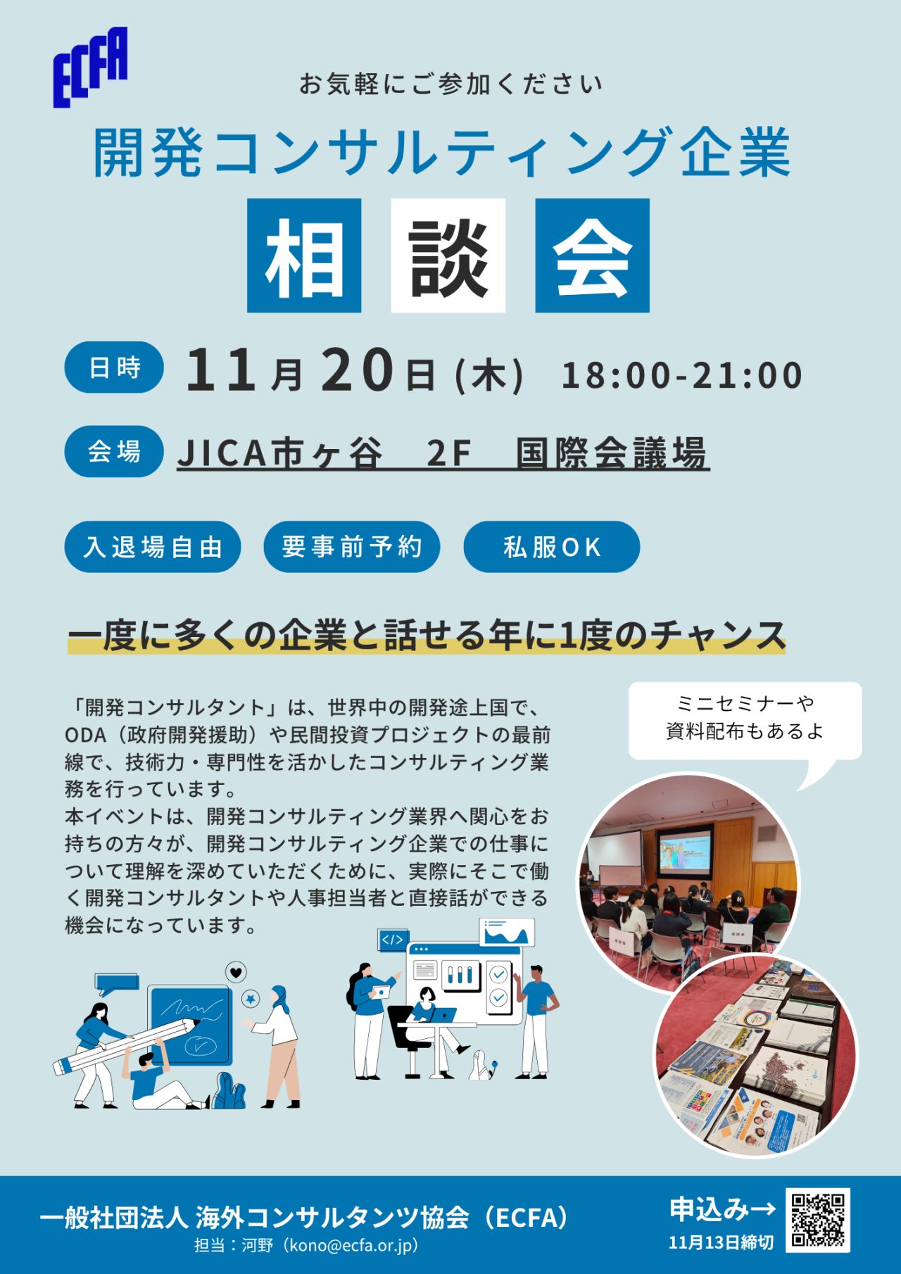 本イベントでは、多数の開発コンサルティング企業が、業界について説明を行います。 パデコも参加しております。 弊社コンサルタントと直接話ができる機会となっておりますので、 業界に興味のある方はぜひご参加ください。 日時 11月20日(木) 18:00-21:00 申込〆切 11月13日 ※添付資料のQRコードからお申し込みください。 会場 JICA市ヶ谷 2F 国際会議場